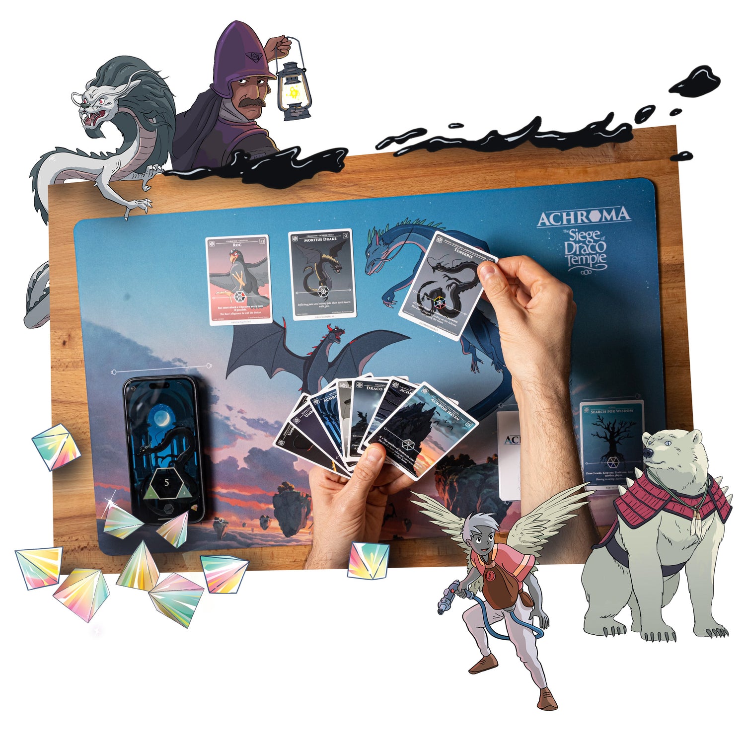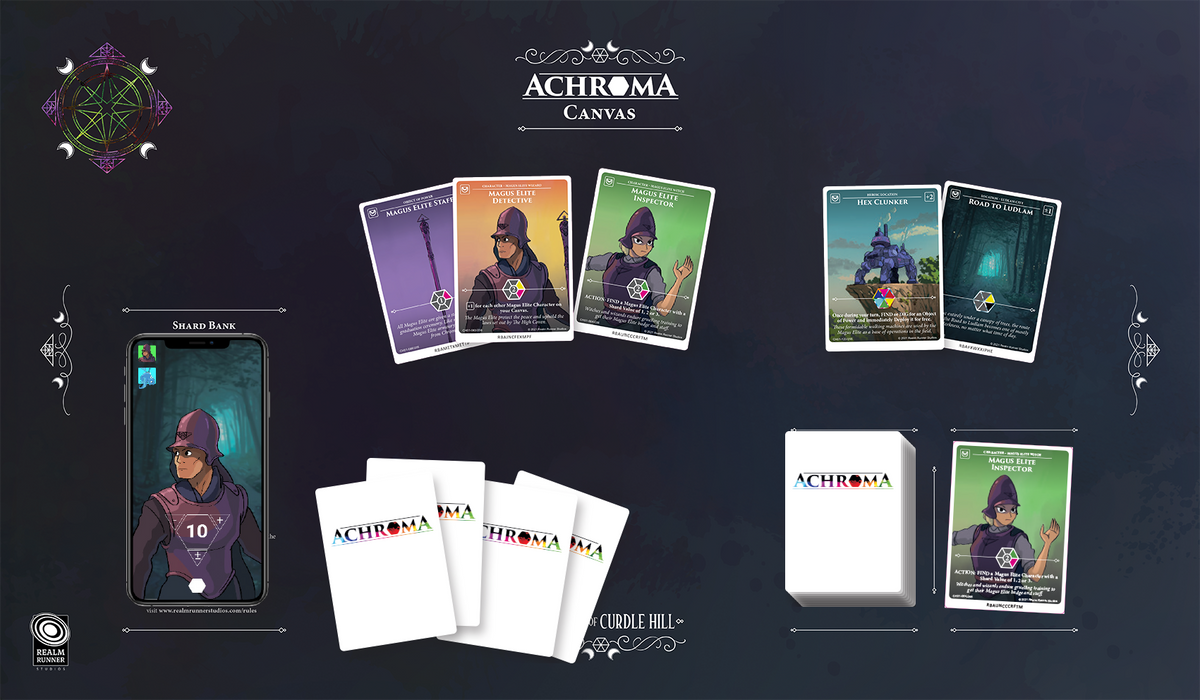 Achroma is a fantasy card game for 2-6 players. Battle to shape the future of the Five Realms where the ravages of a dark energy called Achrom is spreading, diminishing the magical life force known as Chroma.