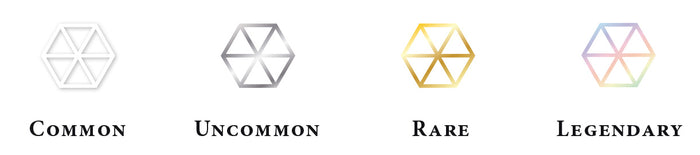 Hex | Represented by a hexagon in the middle of the card and has multiple functions. The colour of the frame tells you the rarity of the card: